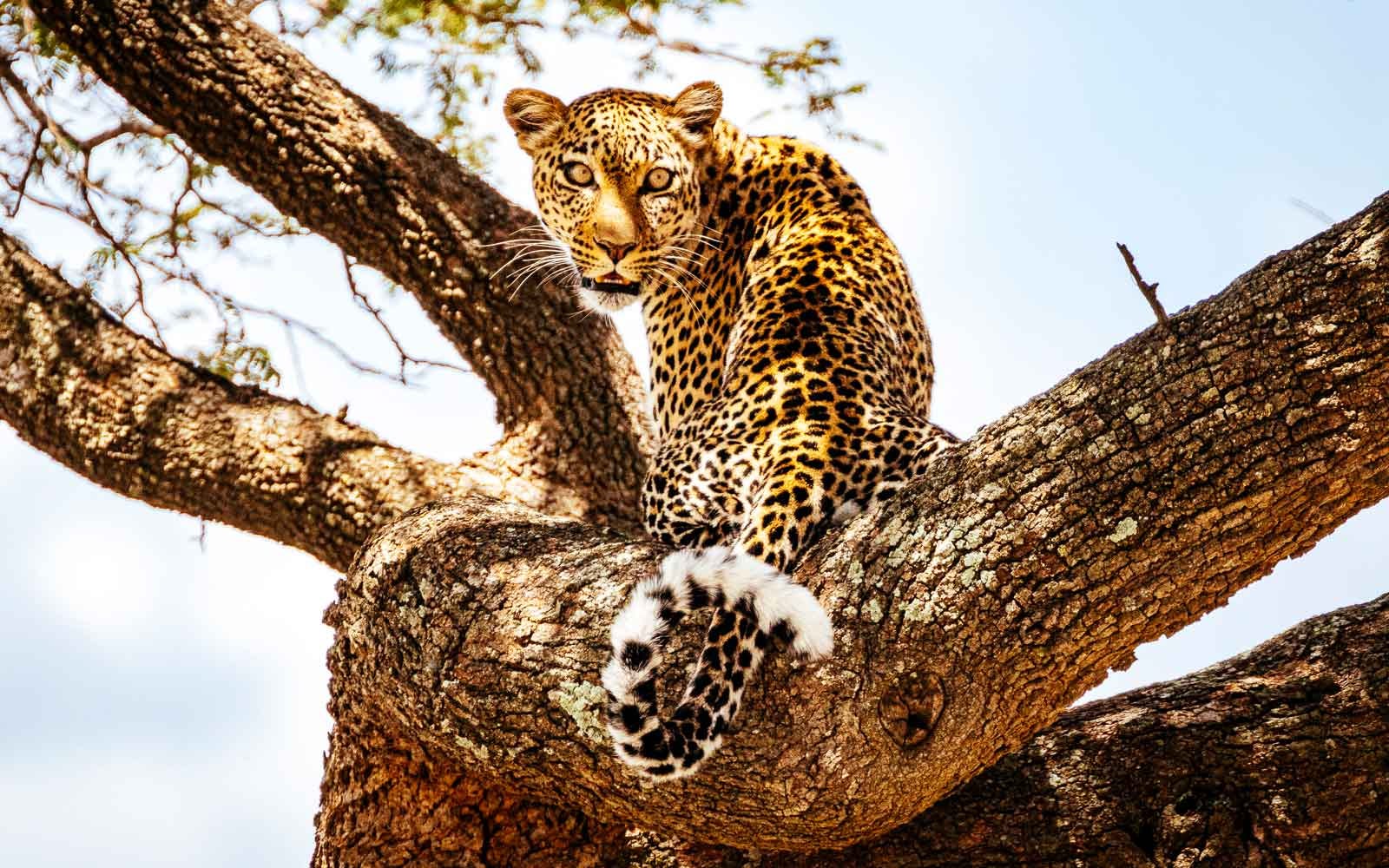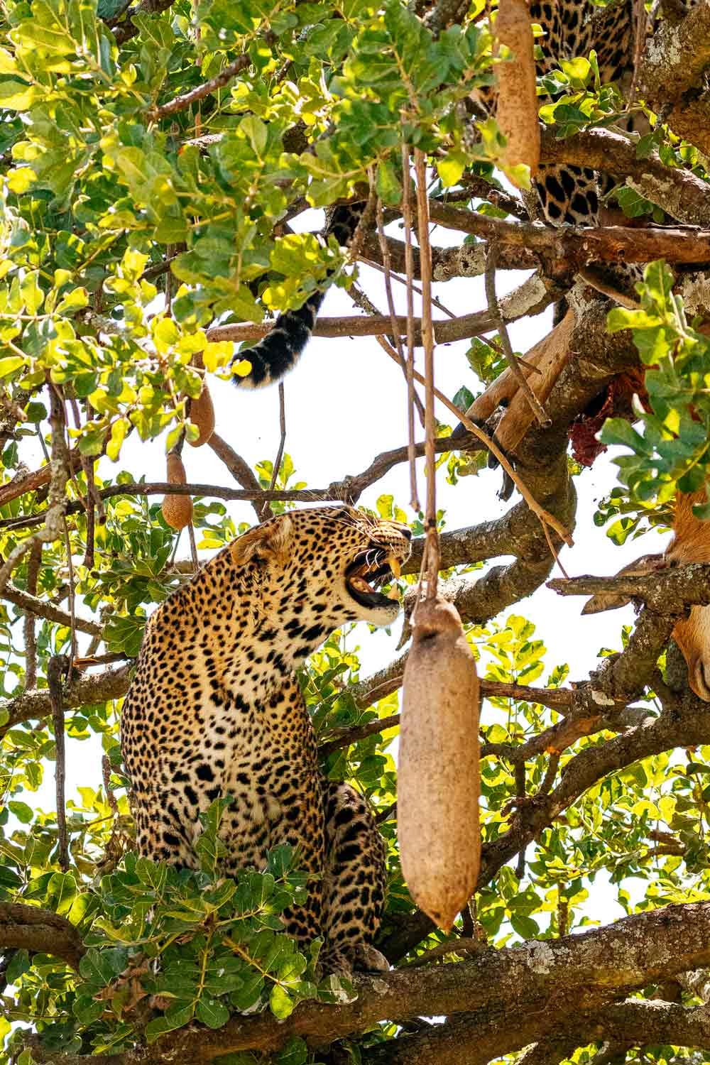 We chanced upon two leopards in one tree. A younger leopard was trying to poach an older leopard’s kill and the older leopard was having none of that. After a brief tussle of snarls and leaves flying every which way, the older leopard was victorious. He celebrated by napping next to his trophy. The younger one skulked to the other side of the tree and settled in for a nap. We hung around for over an hour just watching them pant and sleep.