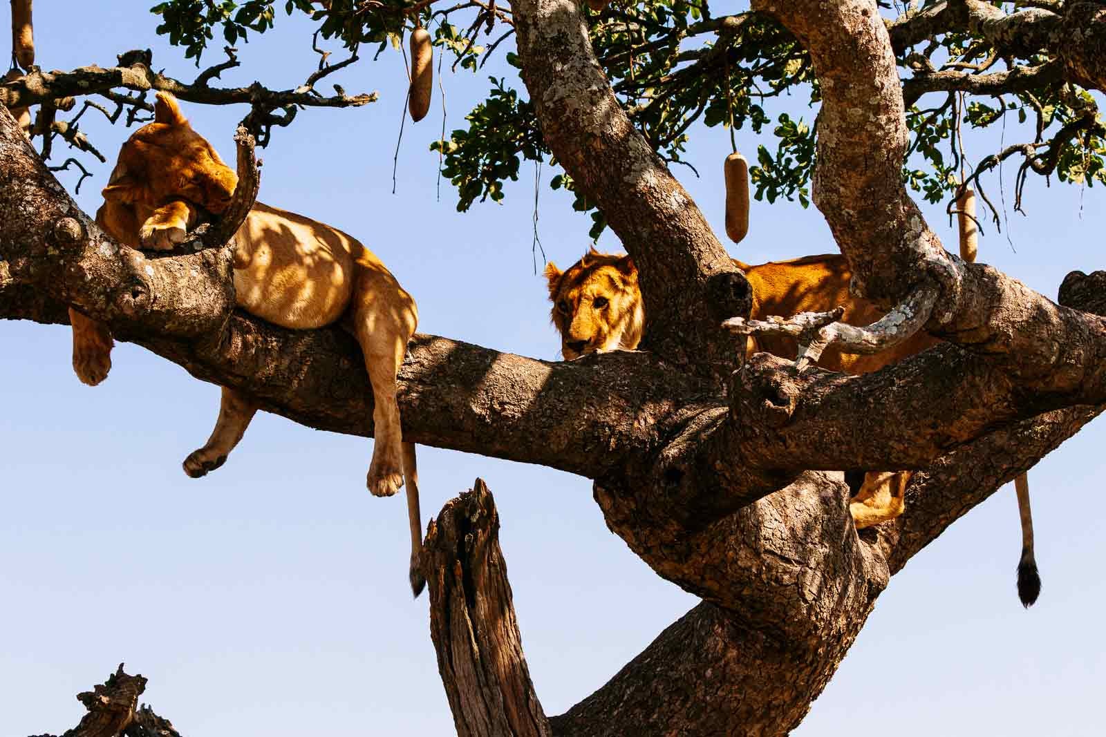 Continuing with the tree theme: we found a lioness napping in a tree, her pride almost invisible beneath her in the grass shaded by the tree. When one of the young males tried to share her comfy spot, a couple no-nonsense snarls convinced the youngster to look elsewhere. The young male tried very hard to find another comfy spot in the tree but eventually gave up and joined the rest of the pride in the shaded grass. We spent over an hour just watching them.